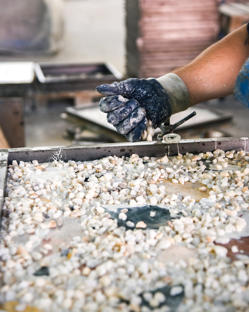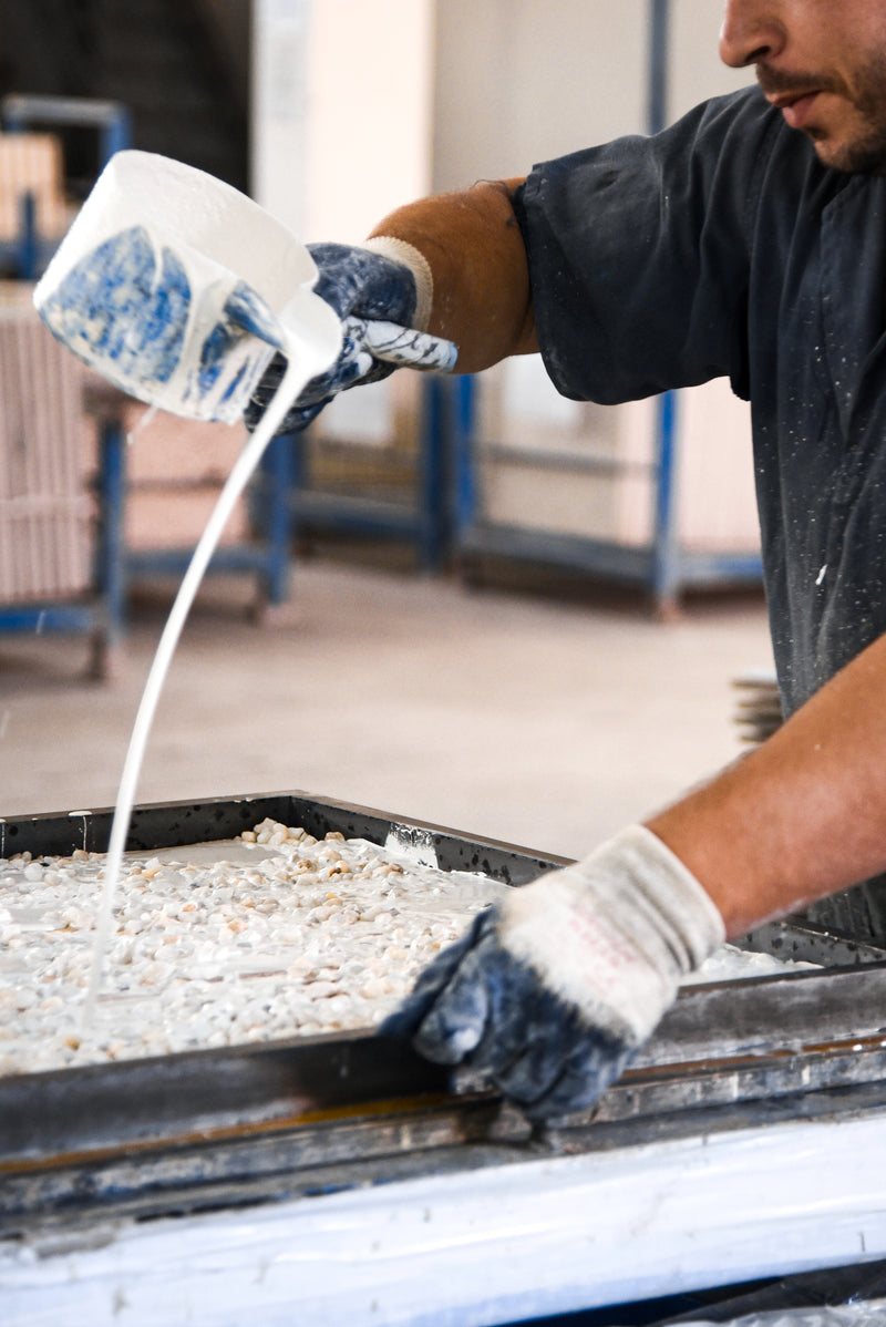 We collaborate with selected partner workshops across the European Union, sourcing only the highest-quality raw materials and working with producers known for their craftsmanship and precision. Each terrazzo element is cast and finished by hand, developed to our exact specifications in small, specialized manufactories.